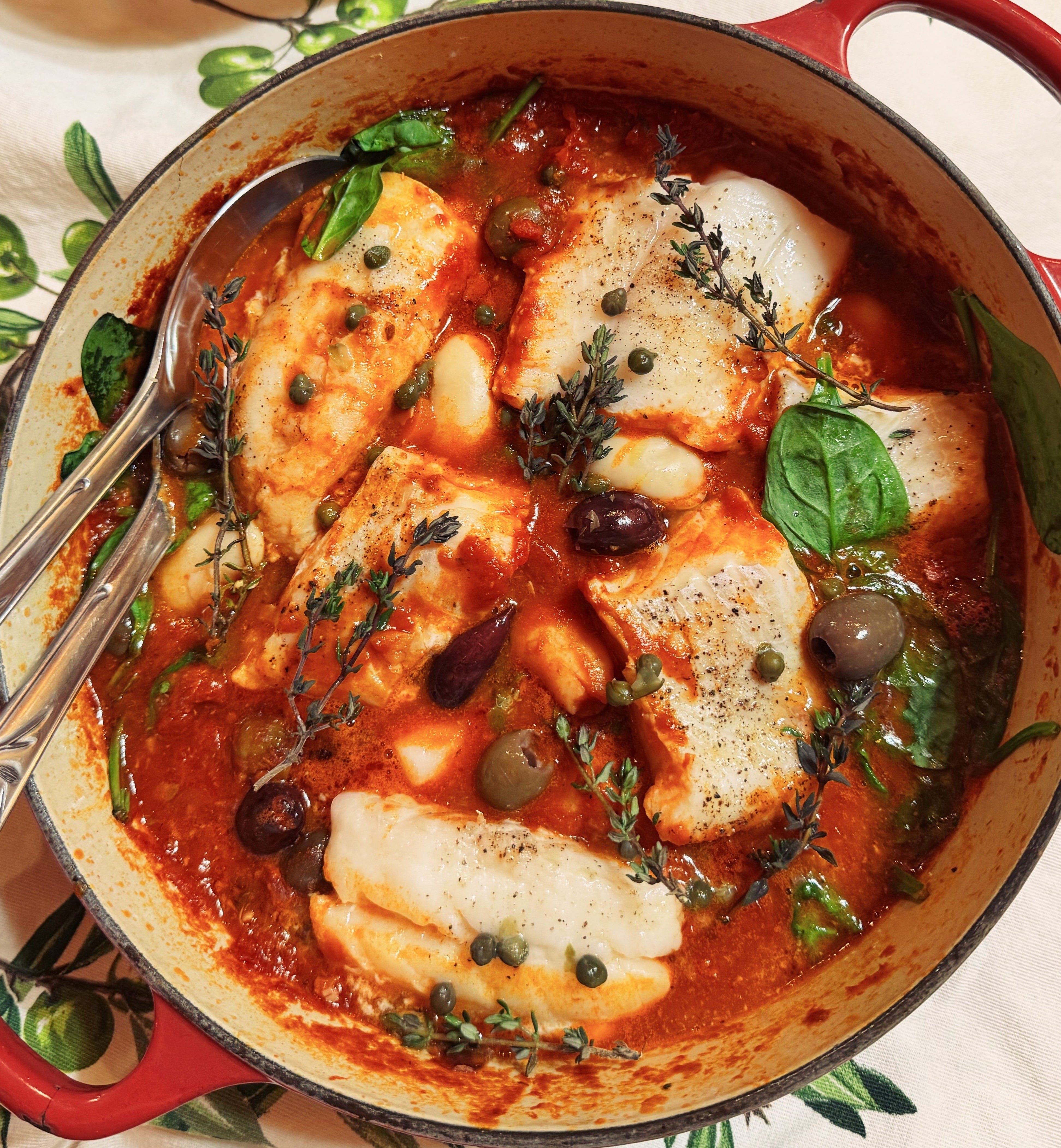 Cod Puttanesca with Butter Beans and Spinach